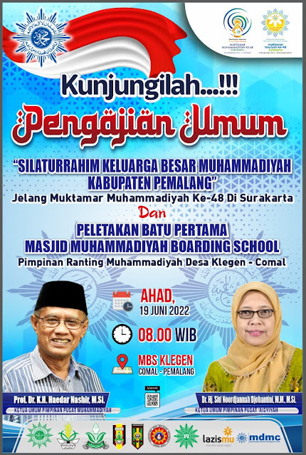 Pemalang- Jelang Muktamar Muhammadiyah Kabupaten Pemalang akan menggelar pengajian umum dan silaturrahmi yang akan dilaksanakan pada hari minggu tanggal 19 juni 2022 di di Gedung Muhammadiyah Boarding School (MBS), Desa Klegen, Kecamatan Comal. Dengan menghadirkan Pembicara Ketua Umum Pimpinan Pusat Muhammadiyah Prof Dr.H.Haedar Nashir dan Ketua Pimpinan Pusat Aisyiah Dr.Hj. Siti Noordjannah Djohantini, M.M., M.Si.