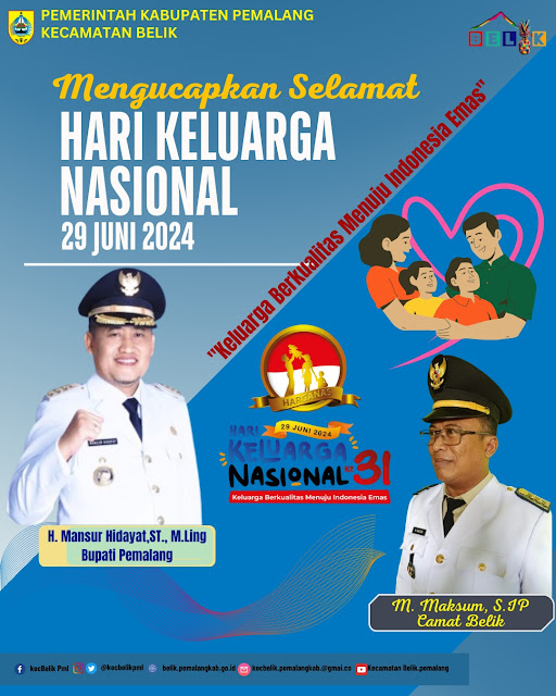 Pemalang-Camat Belik Muchammad Maksum S.IP menyampaikan ucapan selamat Hari Keluarga Nasional 2024, yang diperingati pada 29 Juni. Hari Keluarga Nasional (Harganas) merupakan momen penting untuk mengingatkan masyarakat akan peran vital keluarga dalam membangun bangsa dan meningkatkan kesejahteraan.